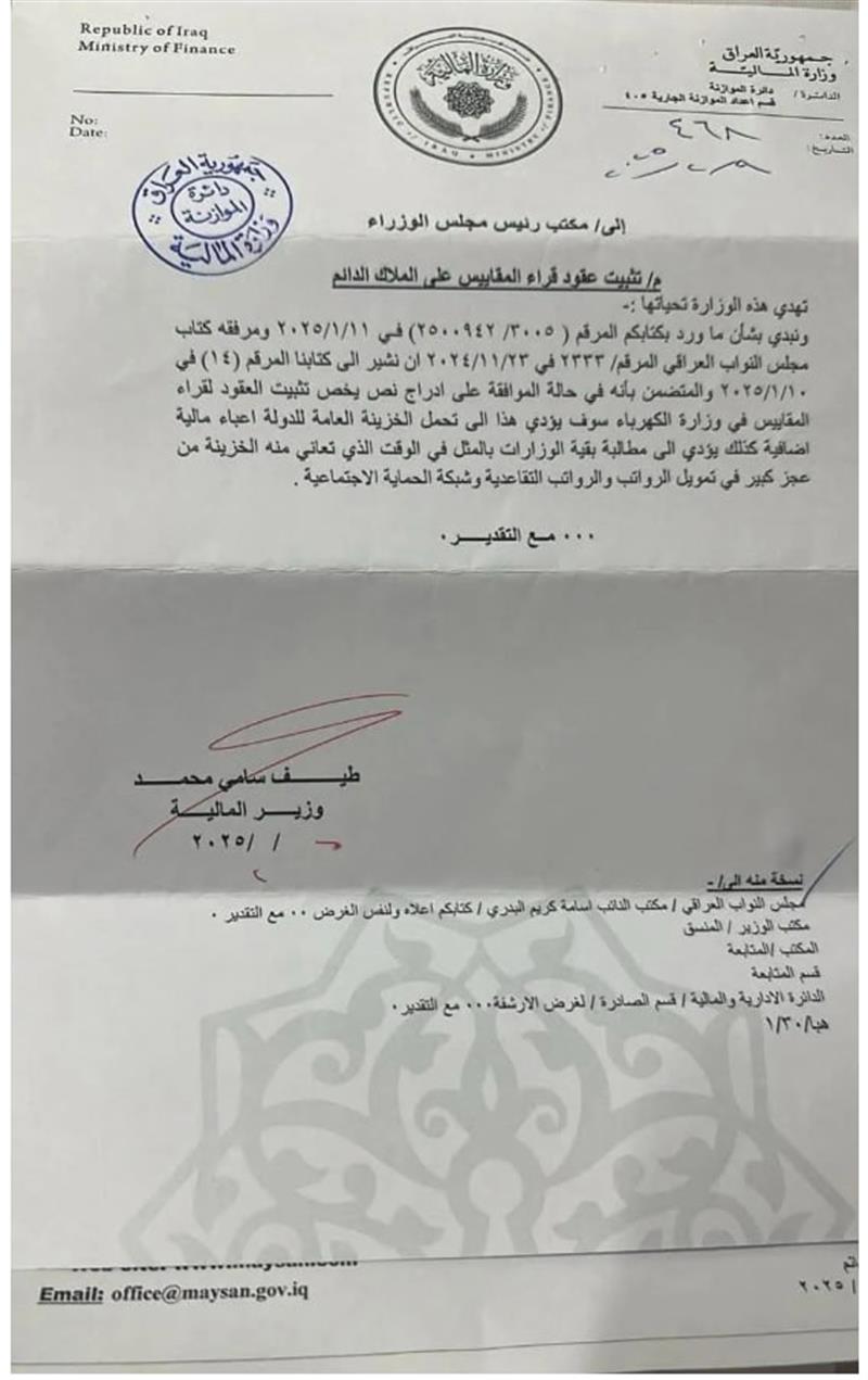 بهگوێرهی نوسراوهكهی وهزارهتی دارایی كه واژۆی تهیف سامی لهسهره ئاماژهی بهوهكردوه، ئهگهر نوسراوی ئهنجومهنی نوێنهران بۆ بهههمیشهییكردنی كارمهندانی گرێبهستی وهزارهتی كارهبا جێبهجێبكرێت، بارگرانی زیاتر لهسهر بودجهی گشتی وڵات دروستدهكات.