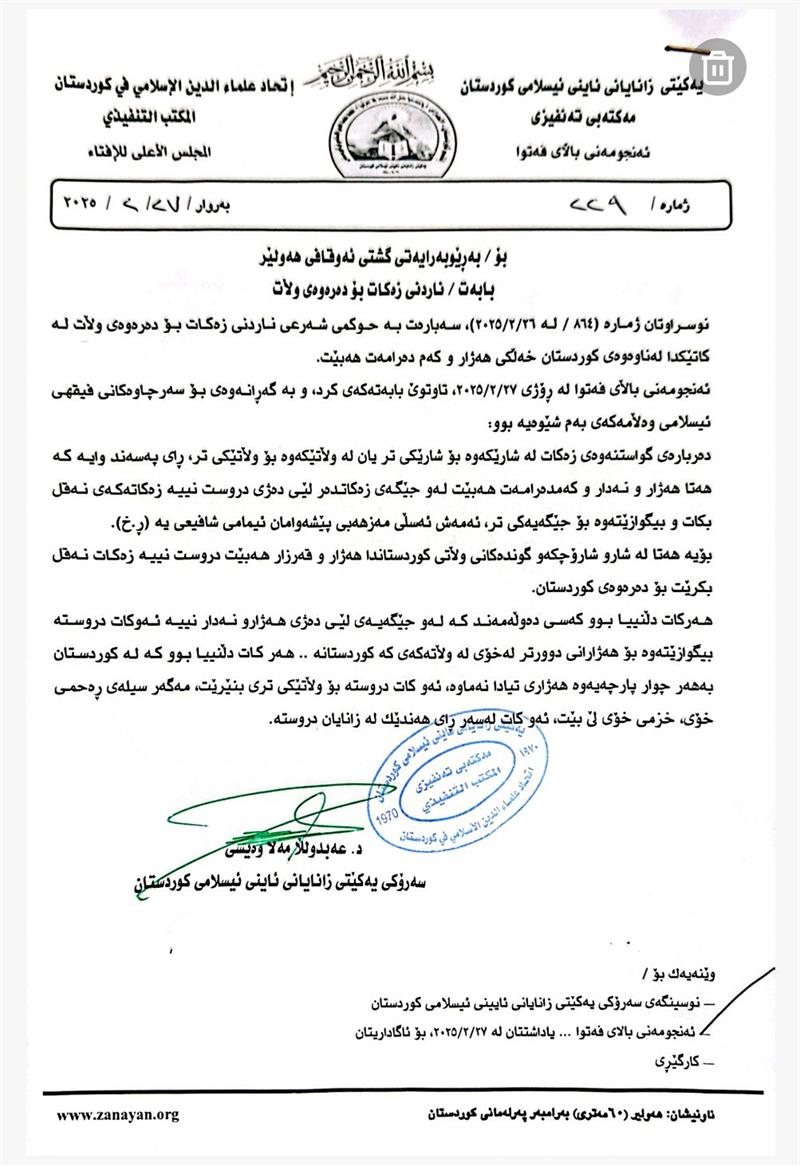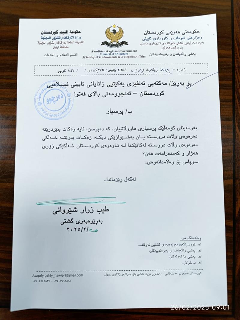 بەڕێوەبەرایەتی گشتی ئەوقاف و كاروباری ئایینی پارێزگای هەولێر، لەبارەی زەکاتەوە نووسراوێکی ئاڕاستەی ئەنجوومەنی فەتوا کردووە و تێیدا داوایا ڕوونکردنەوە لە زەکات دەکات و دەڵێت”ئایا دروستە زەكات بنێردرێتە دەرەوەی كوردستان؟”.