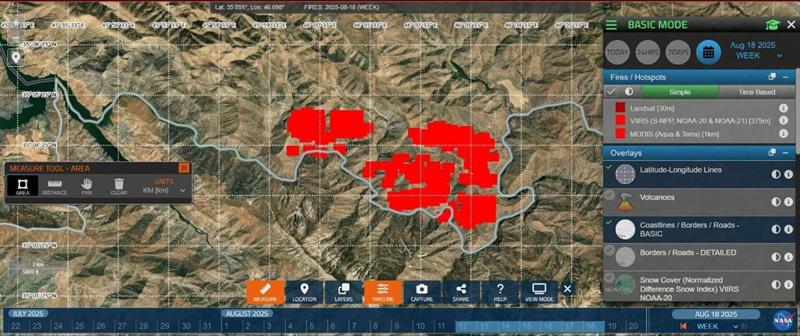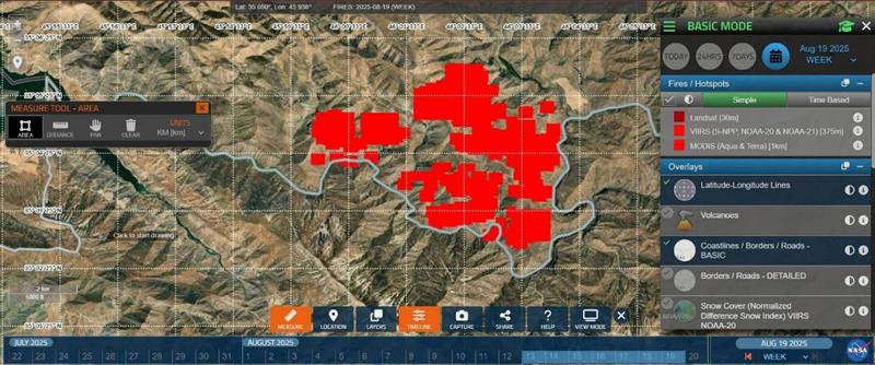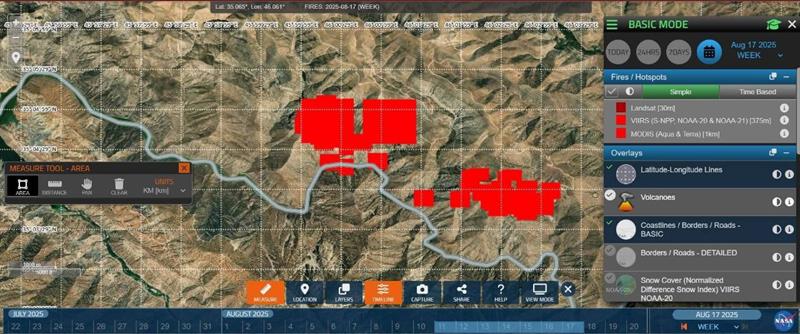 رۆژی سێیهم: رێكهوتی(١٩/٨/٢٠٢٥) رووبهرهكه بهرزبووهتهوه بۆ (١٥.٩٧كم٢)، واته بهراورد به رۆژی دووهم رووبهری(٤.٤٧كم٢) زیادیكردووه، هاوكات بهراورد به رۆژی یهكهم رووبهری سووتاو بۆ (١١.٣٣كم٢) زیادیكردووه.