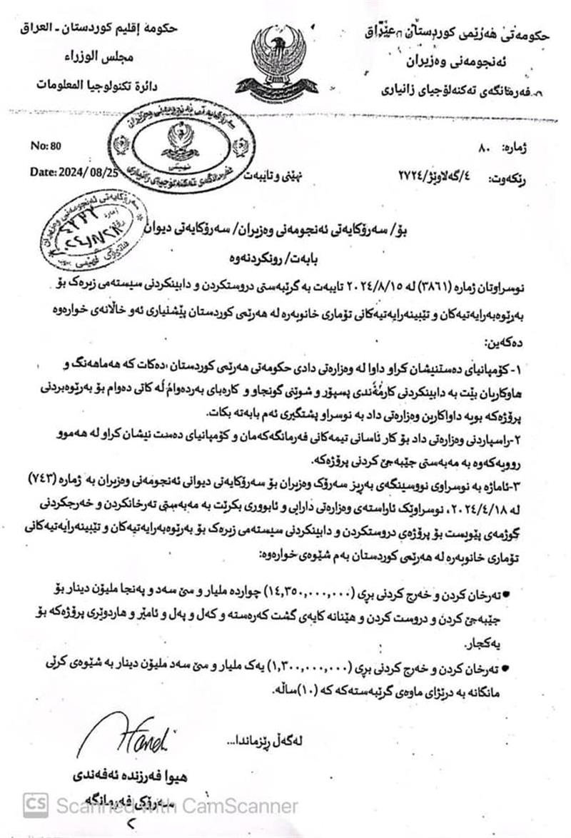عهلی حهمهساڵح، ئهندامی پهرلهمانی كوردستان نوسراوێكی بڵاوكردوهتهوه كه واژۆی هیوا ئهفهندی، سهرۆكی فهرمانگهی تهكنهلۆجیای زانیاری لهسهره و ئاڕاستهی سهرۆكایهتی ئهنجومهنی وهزیران كراوه، تیایدا هاتوه، "نوسراوتان به ژماره (3861) له 15ی 8ی 2024 تایبهت به گرێبهستی دروستكردن و دابینكردنی سیستهمی زیرهك بۆ بهڕێوهبهرایهتییهكان و تێبینهرایهتییهكانی تۆماری خانوبهره له ههرێمی كوردستان پێشنیازی چهند خاڵێك دهكهین".