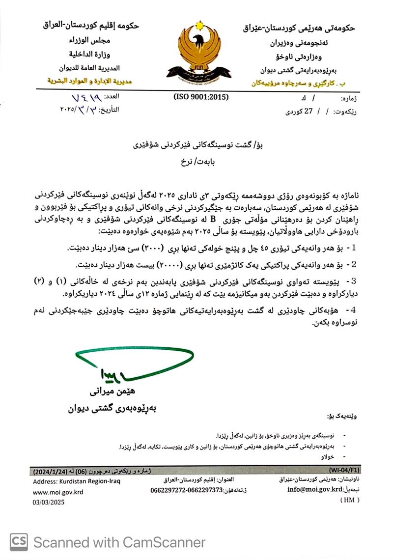 بەڕێوەبەرایەتی گشتی هاتوچۆی هەرێمی کوردستان له نوسراوێكدا كه ئاڕاستهی نوسینگەکانی فێركردنی شۆفێری كردوه، تیایدا هاتوه، "نرخی وانەکانی تیۆری و پڕاکتیکی لە نوسینگەکانی ڕاهێنان و فێرکردنی شۆفێری بۆ دەرهێنانی مۆڵەتی شۆفێری جۆری (B) بەڕەچاوکردنی بارودۆخی دارایی هاوڵاتیان بۆ ساڵی 2025 جێگیرکراوه".