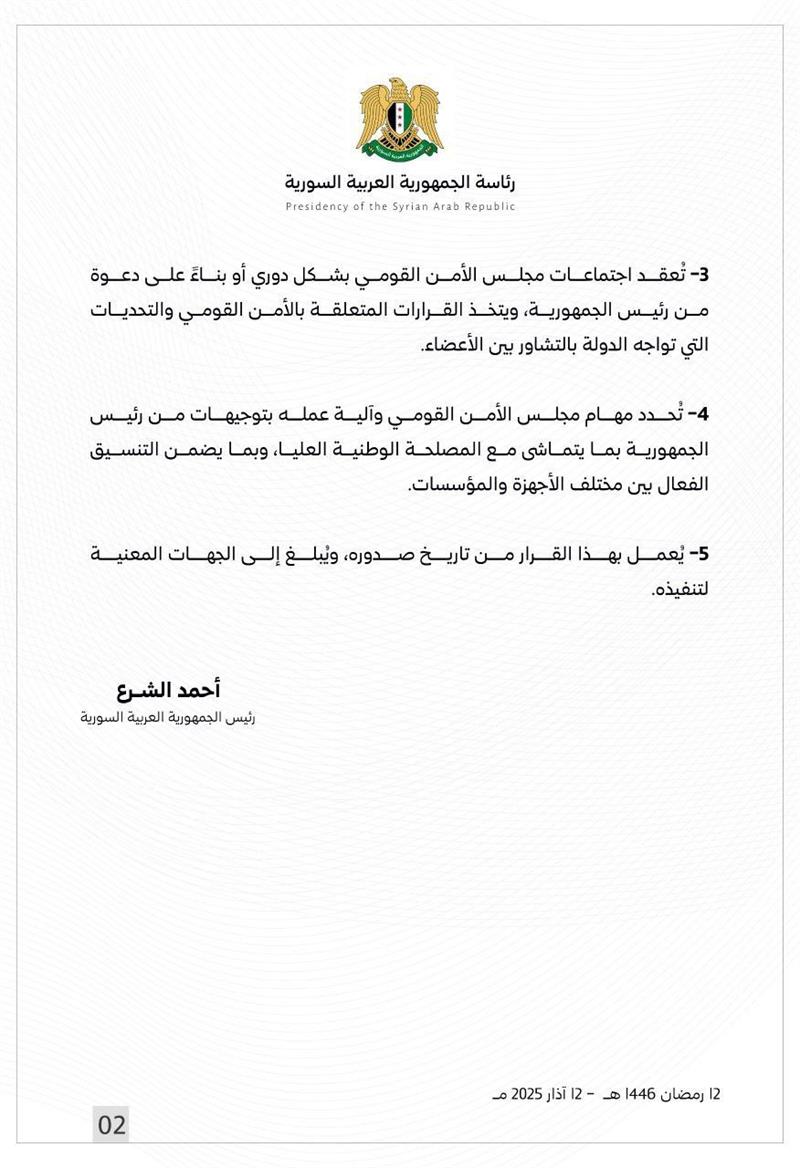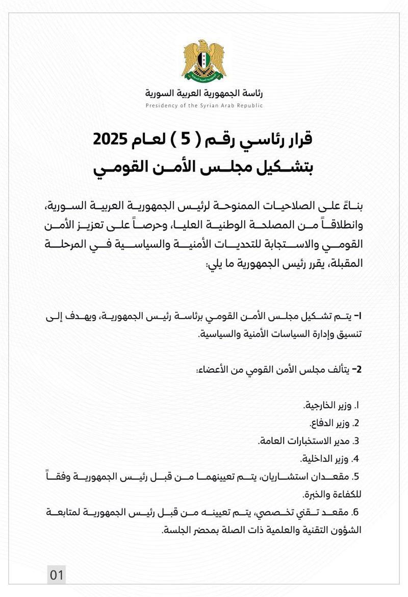 ئەحمەد شەرع، سەرۆککۆماری سووریا بۆ قۆناغی راگوزەر، ئەنجوومەنی ئاسایشی نەتەوەیی دامەزراند، کە خۆی سەرۆکایەتیی دەکات و لە حەوت ئەندامیش پێکدێت.