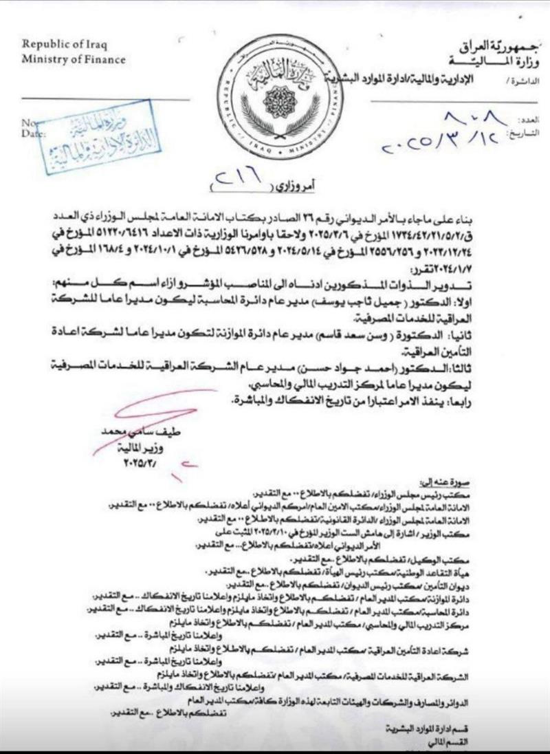 بەگوێرەى نووسراوەکە، جەمیل ساجب یوسف، بەڕێوەبەرى گشتیى فەرمانگەى ژمێریاری کراوەتە بەڕێوەبەری گشتیى کۆمپانیاى عێراق بۆ خزمەتگوزاریى بانکى، هەروەها وەسن سەعد قاسم، بەڕێوەبەرى گشتیى فەرمانگەى بودجە، کراوەتە بەڕێوەبەرى گشتیى کۆمپانیاى گەڕانەوەى سپاردەى عێراقى.