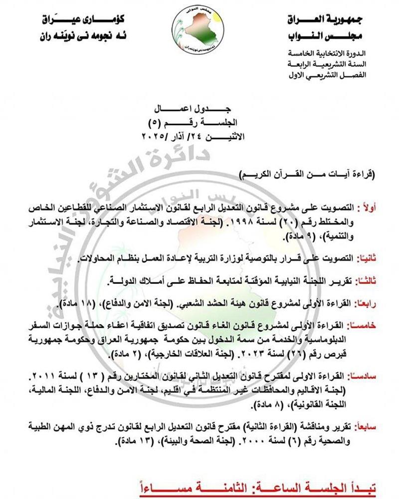 د. بڕیار رەشید ئەندامی ئەنجومەنی نوێنەرانی عیراق لەفراكسیۆنی یەكێتی رایگەیاند: "بڕیار وایە ئەمڕۆ دووشەممە 24ی 3ی 2025 كۆبوونەوەی ئەنجوومەنی نوێنەرانی عیراق بەڕێوەبچێت و تێیدا پڕۆژەیاسای دەستەی حەشدی شەعبی كەلە 18 ماددە پێكهاتووە، خوێندنەوەی یەكەمی بۆ بكرێت".