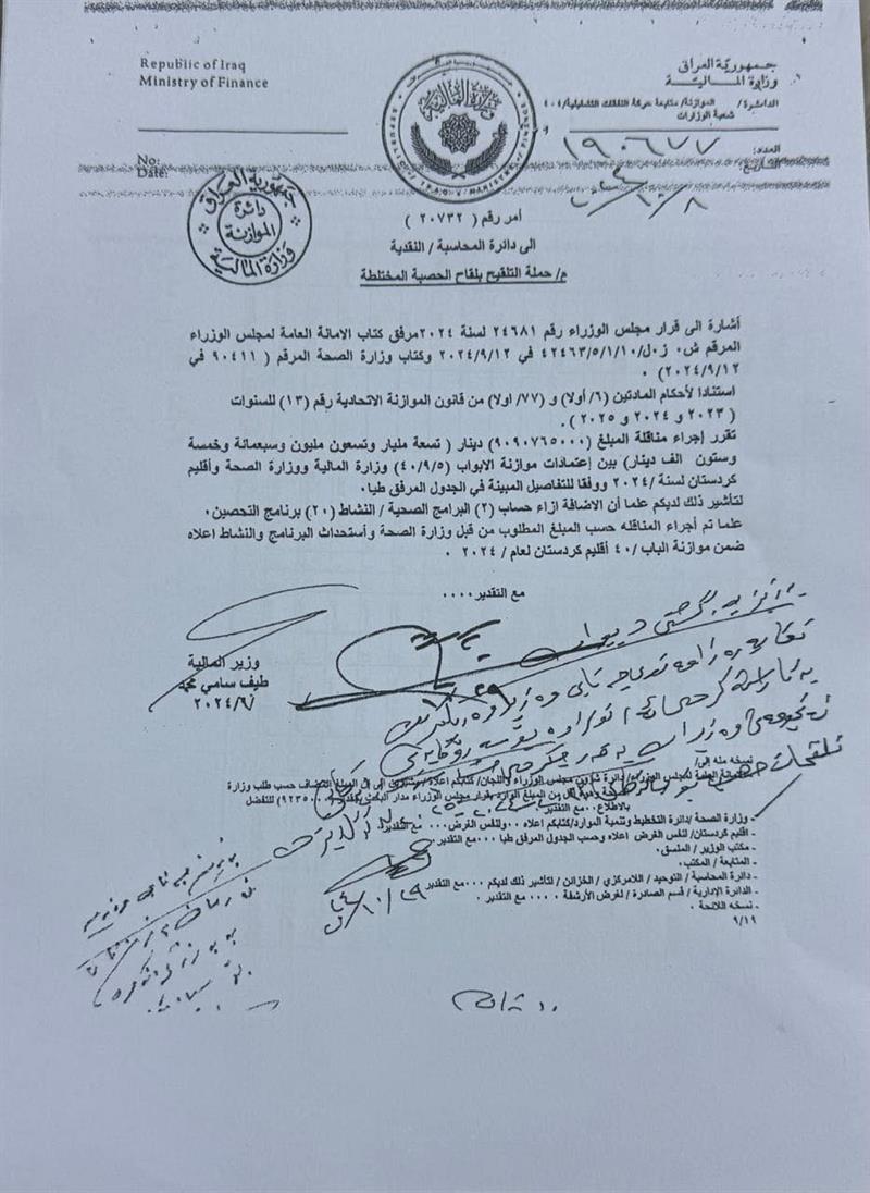 4- وهك وهزارهتی دارایی و ئابوری ههرێمی كوردستان دوپاتی دهكهینهوه لهگهڵ ناردنی ئهو بڕه پارهیه له بهغداوه ڕاستهوخۆ دهخرێته سهر ههژماری بانكی وهزارهتی تهندروستی تا بهسهر تیمهكان دابهش بكرێت.